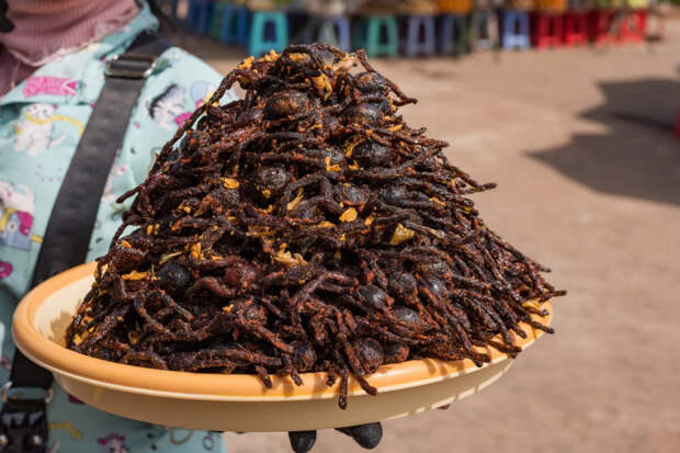 Жареные тарантулы — обычная уличная закуска в Камбодже и Таиланде. Сначала пауки очищаются и приправляются солью и травами, а затем обжариваются. После этого их иногда обваливают в сахаре или чесноке, чтобы придать им дополнительный вкус.
