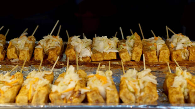 После того как тофу выдержали положенное время в маринаде, обычно его жарят во фритюре. Подают вонючий тофу с соусом чили, соевым соусом и маринованными овощами. Если вы попробуете это блюдо, то тофу больше никогда не покажется вам скучным продуктом.