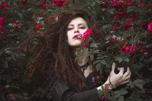 Модель с цветами в парке можно сфотографировать интересно, если придумать необычную позу и ракурс. А ещё здесь лицо поднято к солнцу, поэтому нет грубых некрасивых теней на коже