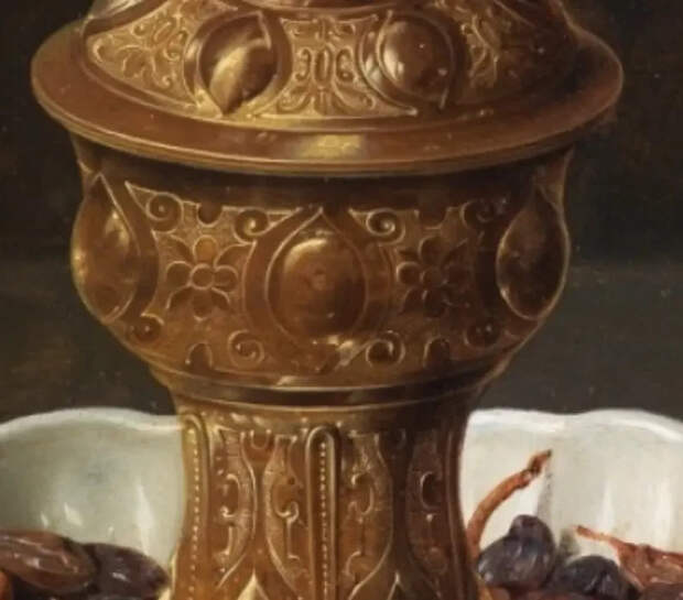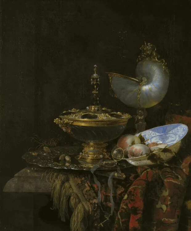 Панцири этих моллюсков привозили в Нидерланды из далёкого Индийского океана. Они были признаком богатства и процветания, а чаши из них часто включали в натюрморты, чтобы подчеркнуть красоту и экзотичность композиции. Сочетание металла и известкового покрова позволило Кальфу экспериментировать со светом и тенью, играя с отражениями и полупрозрачными материалами. Раковина оформлена в виде библейского кита, проглотившего Иону. Фигурку пророка можно различить на верхушке чаши — он словно собирается нырнуть в раковину наутилуса, спасаясь от зубов чудовища.
