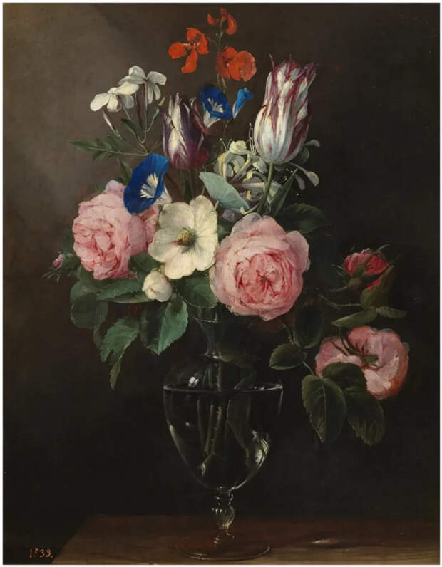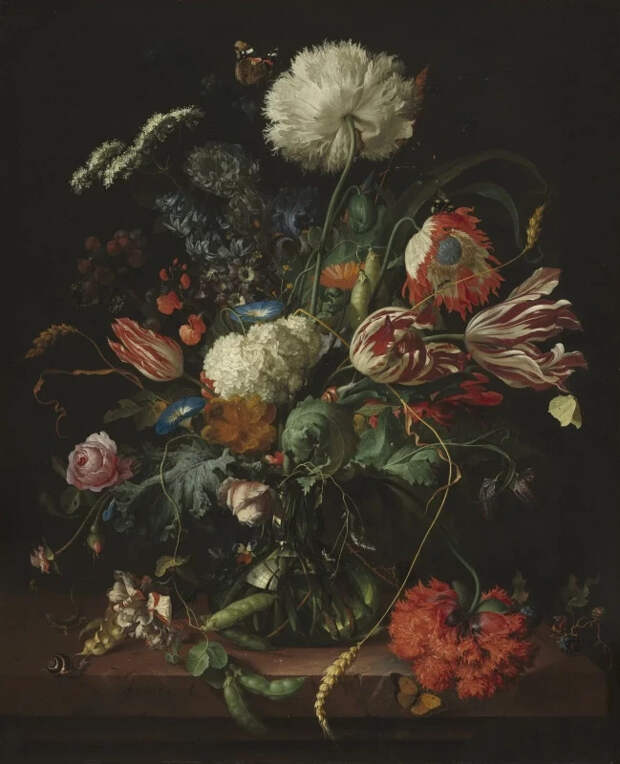 Тридцать один вид растений в «Вазе с цветами» (ок. 1660) из Национальной галереи искусств в Вашингтоне не может цвести в одно время года. Многие из этих цветов имеют символическое значение. Верхние распускаются в солнечном свете, который струится через окно студии де Хема (оно отражается в стеклянном сосуде). Те, что ниже, лишены небесного света, они поникают и увядают.