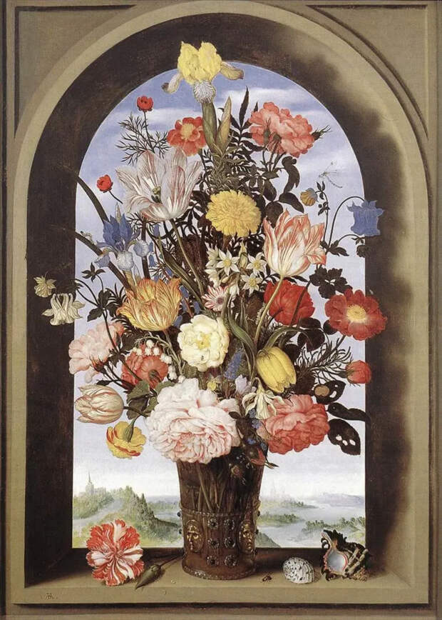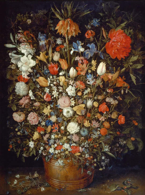Ян, родившийся за год до смерти своего знаменитого отца Питера Брейгеля Старшего, был одним из первых художников, сосредоточившихся на цветочных натюрмортах. Его даже прозвали Брейгелем «Цветочным» или «Бархатным». Он дружил с Питером Паулем Рубенсом, и вместе они создали ряд работ, где первый писал окружающую среду и декорации, а второй — персонажей. Отличный пример тому — серия «Пять чувств», которая сейчас находится в Музее Прадо в Мадриде.Ян Брейгель Старший предпочитал изображать цветочные композиции в вазе или сосуде, причем с уже упомянутым сочетанием растений на всех фазах цветения — такие букеты никогда не могли быть написаны с натуры.