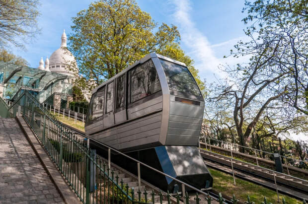 Пассажиры, расположившиеся в кабинах фуникулера, следуют от основания Монмартра до его самых высоких точек. Таким образом можно добраться до базилики Сакре-Кер.