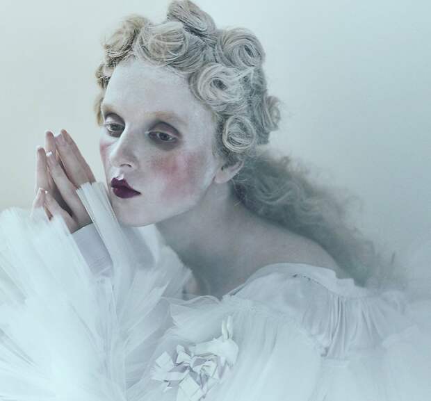 Идея базируется на стилизации образа модели под рококо. Пышные юбки, корсеты, богатые ткани, жемчуга, утончённость и нежная пастельная палитра будут отлично сочетаться с меланхоличным зимним ландшафтом.