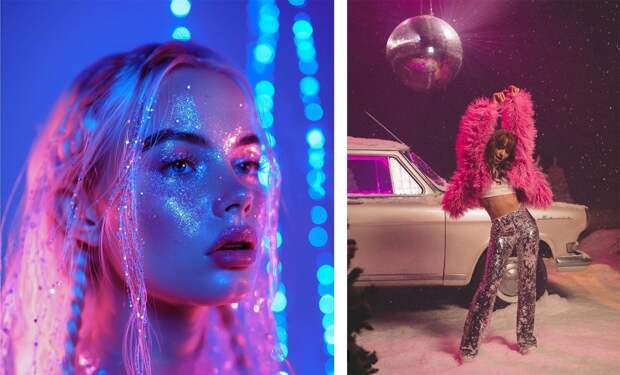Сочетание холодной зимы и яркого неона на снегу и модели создадут интересный эффект. Чтобы воплотить идею, используйте LED-свет, который может светить любым цветом. Если у вас всего один источник, а докупать ещё пока не планируете — ищите в городе неоновые вывески около кафе, баров, ресторанов.