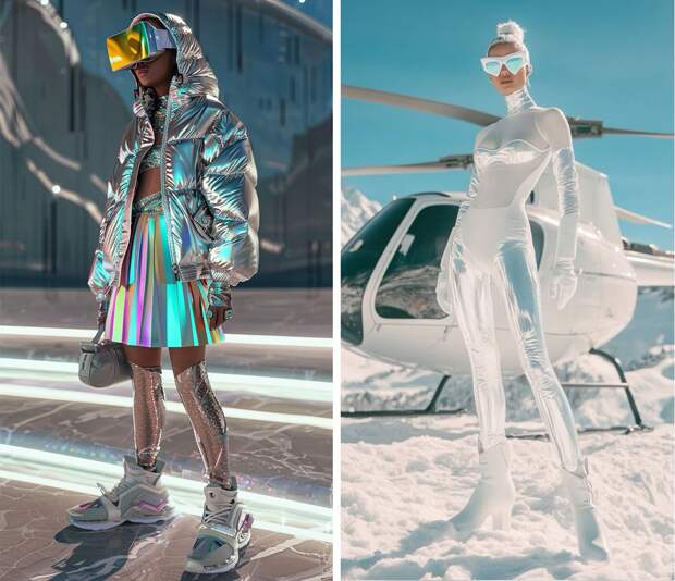 Образ:модель в полностью белом, сером или чёрном образе с минималистичным макияжем на фоне снега и белого облачного неба. Будут хорошо смотреться минималистичные и крупные серебряные аксессуары. Если хочется акцента, добавьте любую яркую деталь, но одну: синие перчатки, красный шарф, фиолетовые губы, зелёные сапоги.
