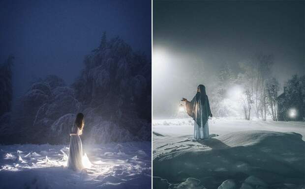 На белом ландшафте поиграйте с силуэтами и светотенью. Снимать придётся на ярком зимнем солнце, когда от человека и деревьев отходят длинные тени. Также подойдут фотофонари с масками гобо, с которыми можно фотографировать в темноте на снегу и в фотостудии, либо в темноте с дополнительным светом.