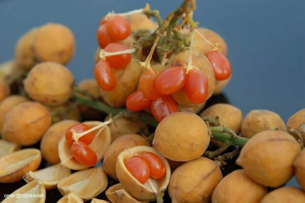 Происхождение: Суматра, Калимантан (Борнео) и Малайзия. Коробочка с фруктами открывается очень необычно — щелчком по коробочке и она «взрывается» выставляя наружу сочные семена красного или белого цвета.