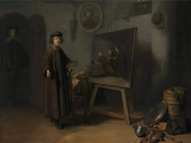 Эта картина, написанная одним из учеников Рембрандта (возможно, Геррита Доу) изображает молодого Рембрандта в его мастерской в Лейдене.