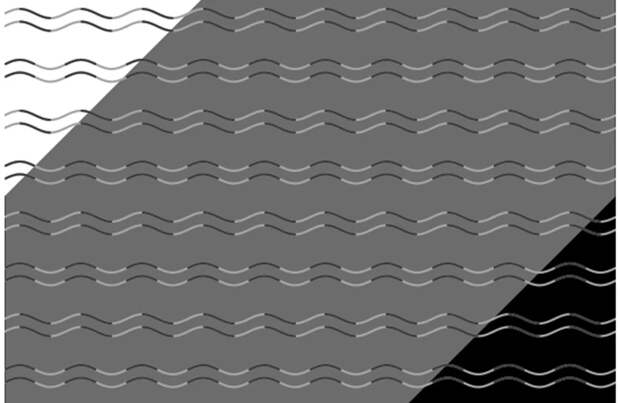 Далее оценивались результаты восприятия иллюзии психолога из Японии Коски Такахаши, при помощи которой можно оценить, насколько Вы «слепы к кривизне». Она представляет собой картинку, на которой изображены волнистые линии. Они имеют одинаковую форму, угол наклона и расположены параллельно друг другу. Но при этом большинство людей воспринимает часть этих линий не как волны, а как зигзаги благодаря их различному окрасу.
