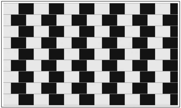 Иллюзия "Стены кафе" состоит в том, что с первого взгляда кажется, что серые линии между чёрными и белыми квадратами расположены под углом, но если присмотреться, то можно увидеть, что линии абсолютно ровные. Мозг, сбитый с толку контрастными и близко расположенными прямоугольниками, видит серые линии как часть мозаики, выше или ниже прямоугольников.
