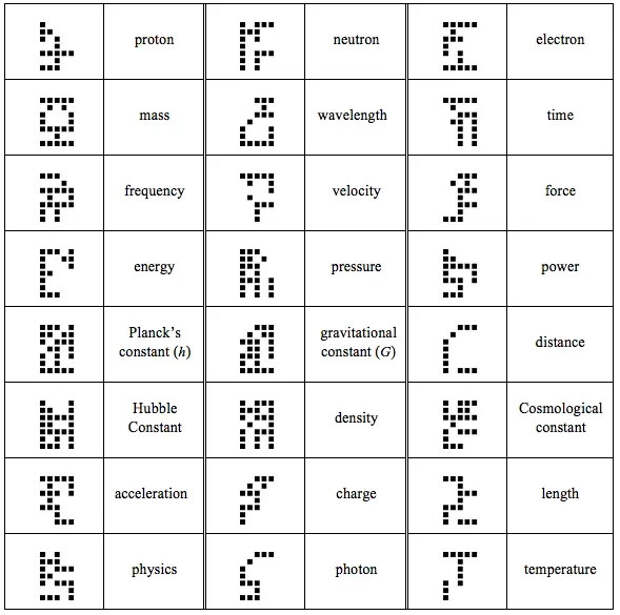 В этой последовательности из 1679 двоичных чисел Саган и Дрейк зашифровали самую важную, на их взгляд, информацию о нашей планете. Это были числа от 1 до 10, формулы некоторых химических элементов и нуклеотидов ДНК, сведения о человеке и Солнечной системе и о радиотелескопе в Аресибо.